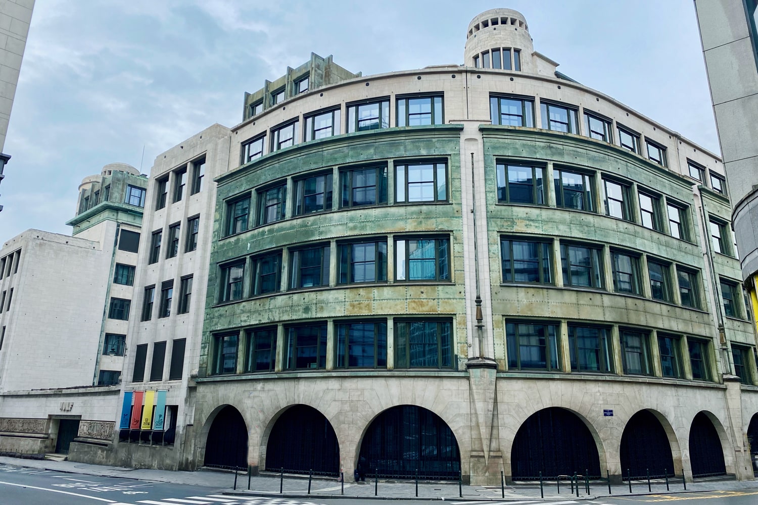 Le plan en fer à cheval du bâtiment central est remarquable, de même que la partie arrondie, habillée de cuivre du Congo, à l’angle de la rue du Fossé aux loups.